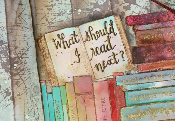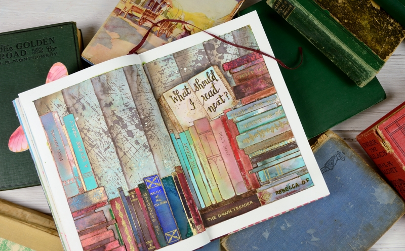 I finished by balancing that open book on one of the piles and added the name of my favourite podcast, ‘What Should I Read Next?’ I get a large chunk of my book recommendations from Anne Bogel, the host of WSIRN. I could talk about books for several more paragraphs but if you’ve made it this far you’re a champion so I’ll save the book chat for another book themed project. I think there will be a spin off card from this journal page.