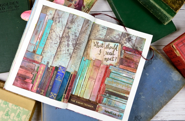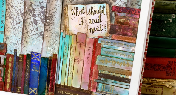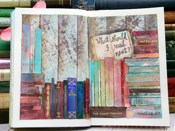 This book themed page has been in my mind for quite a while and that little open book stamp on the right side of the spread pushed me to make it happen. All the stamps are from Darkroom Door; I used ‘mini open book’ once, ‘book spines’ several times and the ‘scratches’ background stamp for the wall behind the books.