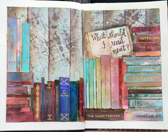 Arranging the books on the page took a little while. I cut them all out first then cut some of the groups into smaller groups to play with the layout. Once I had it settled I glued them down and started adding titles and decoration with gel pens, embossing pens and embossing powder. I wrote quite a few of my favourites on the spines, nothing particularly new even though I have read some great new books lately. I guess they just haven’t stood my test of time yet. I have some empty spines left that I will probably fill another day.
