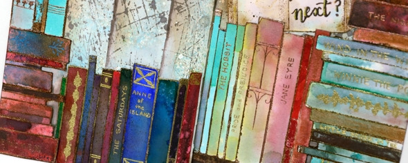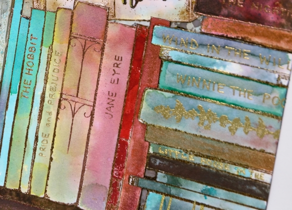 I embossed all the books on hot pressed watercolour paper in either gold or copper powder then coloured them with markers, distress stains and distress inks smooshed on my glass mat. I really just played with techniques until I had a good selection of colours and patterns. I stuck to jewel tones featuring dark green, bright blue, red and aqua. I’ve listed all the distress inks below. I also painted over the inking on a few books with Coliro pearlescent paints so they have a bit of shimmer.