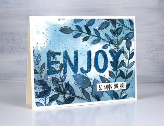 On my second card I created an abstract background first then, once dry, I stamped ‘beloved view’ over the top in versafine clair nocturne ink to create a silhouette,