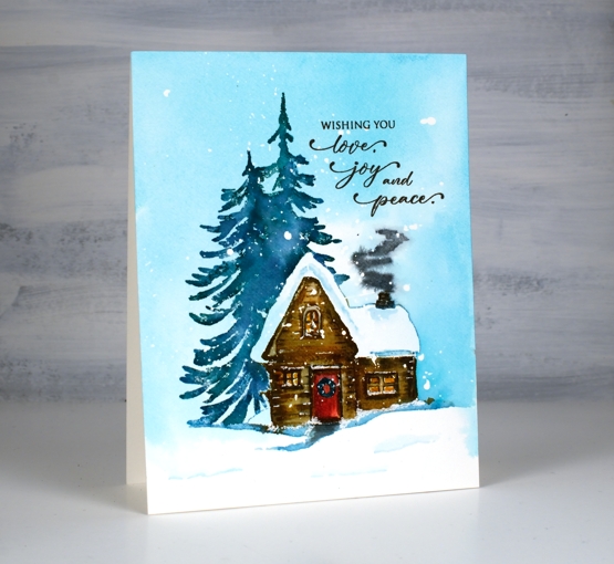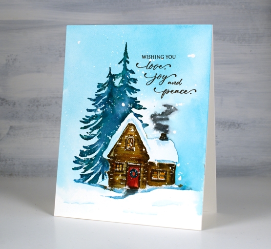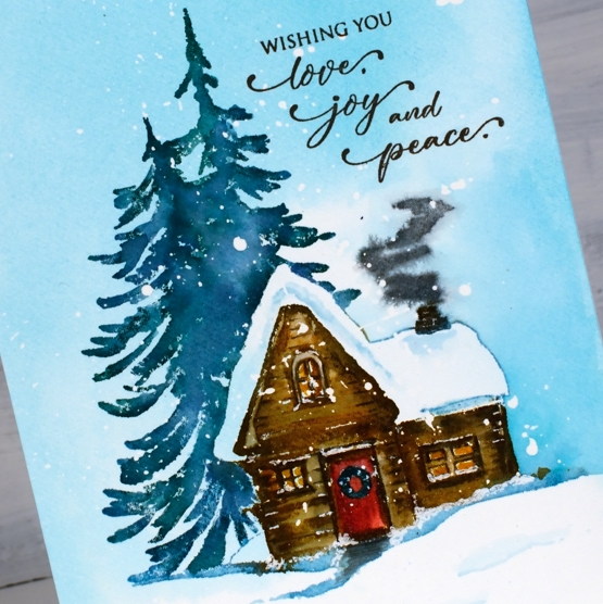 This cute cabib is another new stamp from Penny Black; the set is called ‘Cozy Cabin’ and it includes this tree shadowed cabin plus an extra tree not shown on this card. Once again I enjoyed bringing this scene to life with splattered masking fluid and distress inks.