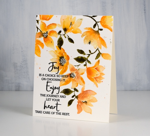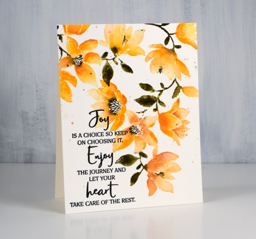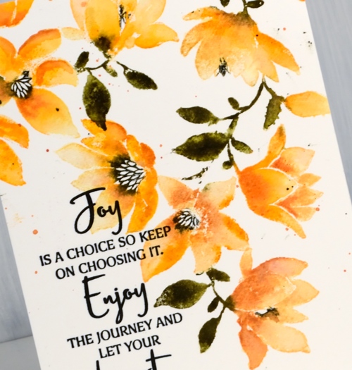 I started by stamping the whole stamp in scattered straw distress ink on hot pressed watercolour paper. While in the positioner I used dried marigold, carved pumpkin, spiced marmalade and rusty hinge inks or markers to gradually add darker colours on the flowers to create depth and shadow. I painted over some of the petals to soften the blends then moved on to stamp the leaves and stems in forest moss stain. Finally I inked the centre of the flowers with a black soot marker to stamp the patterned section.