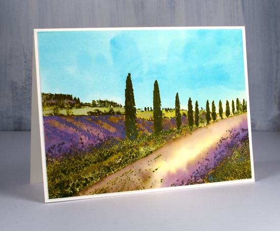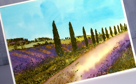 As I built up colour on the trees it was sometimes easiest to ink a large area with the oxide ink then wipe ink off the stamp where I didn’t want that colour. I also pressed the oxide ink pads down on my glass mat so I could pick up colour with a paint brush and apply it to the panel that way. As oxide inks are part dye ink and part pigment I was able to clear emboss over the stamping part way through the process to ‘lock’ in the colour on the foreground trees, grass and background trees. The ‘lavender field’ area is blank when stamped so I painted the rows of lavender with dusty concord and some spots of peeled paint oxide ink, the far fields in crushed olive and the road edges in diluted vintage photo. I loved the pops of purple so much I brought them into my second version also but not in the same way.