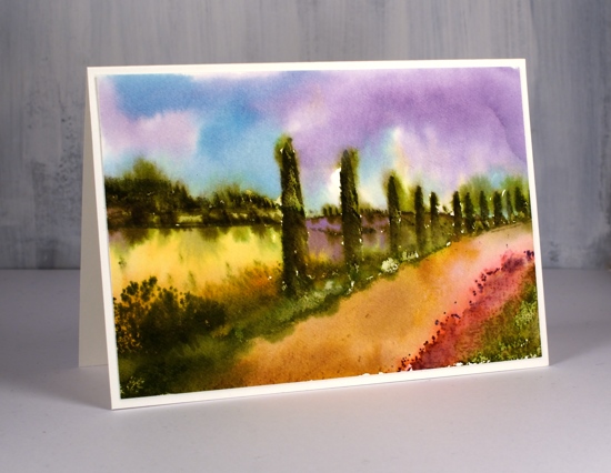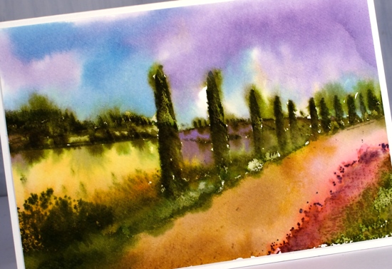 The second card is a looser watercolour look done with no oxides just the original distress inks and markers. I stamped the trees and grasses with forest moss, peeled paint and candied apple (roadside poppies). I was able to get some variety on the trees and grass by blending with a paint brush and re-stamping over the top.