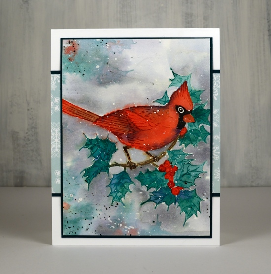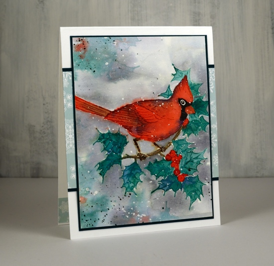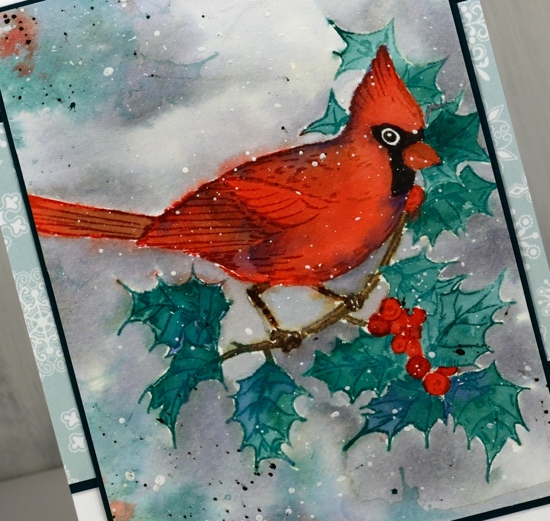 I had reference photos of cardinals on hand to check the colour of the legs and beak. Once all the painting had dried I re-stamped the body of the cardinal in candied apple to darken the details on the back and wings. At this point I had to decide whether I was adding a background or not. In the past I’ve ruined several focal images by adding a background around them. I decided I wanted a grey snowy look so I painted around holly with water and dropped in weathered wood distress stain as I went along. It was fiddly getting in and around the legs and leaves but it’s a loose cloudy look so no fussing about precision. While the background was still wet I inked just a few holly leaves and berries and pressed them onto the wet panel in a few places to look soft and shadowy. I dried everything before splattering some white paint over the whole panel and some black soot in the corners. Even though the mats look black in the photo they are actually teal and the little patterned strip behind is a PB snowflake paper in just the right grey/green colour.