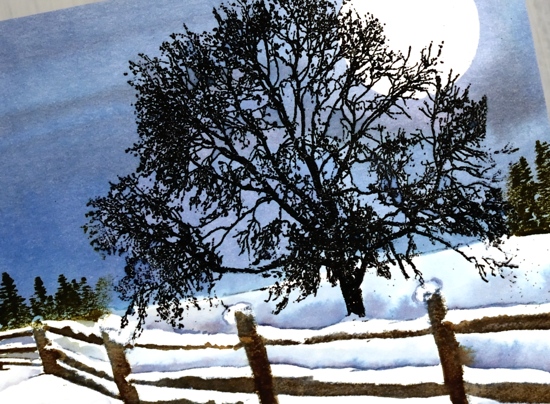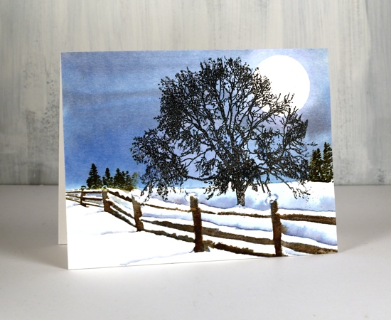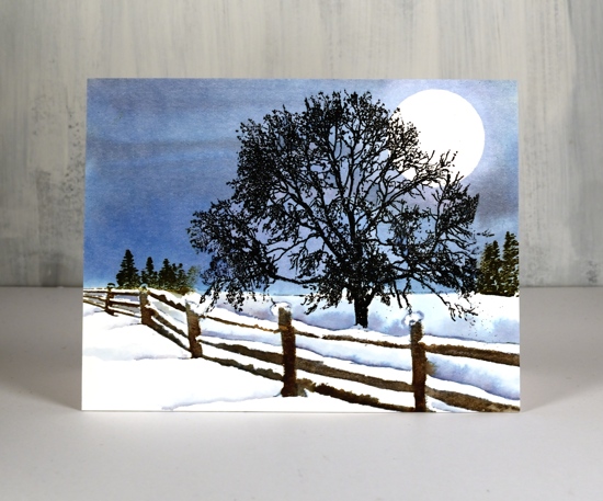 As you can imagine the stamp positioner was my friend for this scene, I worked on the tree first, then the fence and finally the background trees. I inked only the large tree to start with; I used a versafine clair nocturne ink for the centre and finished off the extremities with an embossing marker. I embossed in black powder then put the panel back in the corner of the stamp positioner so it would line up again for the rest of the inking. I stamped the whole scene with stormy sky ink so I could see all the elements and add colours over the top. With the tree complete it was time to add a mask for the moon; I used frisket film which is waterproof then I painted the whole sky in stormy sky, weathered wood and chipped sapphire distress stains. Once that was dry I used ground espresso and black soot distress markers to stamp the fence and the same colour inks on my glass mat to paint over the stamping to get solid coverage and blended colour. Painting blue shadows over the snow was a little tricky but the stamped image has lines to show piles of snow on the fence so I used them as my guide and left the snow untouched. Finally I stamped the background trees in forest moss ink.