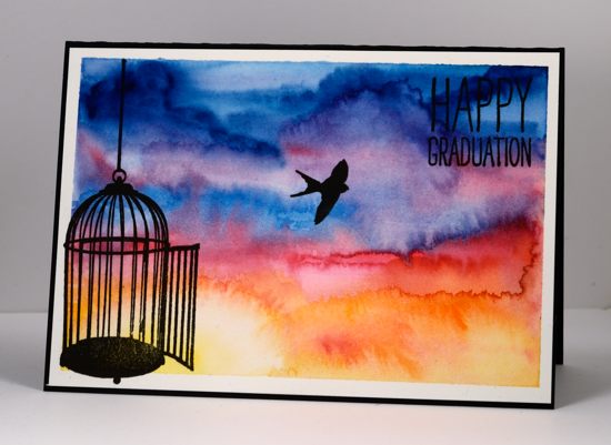 Posted: April 8, 2015 Filed under: For the grad | Tags: Kuretake Gansai Tambi watercolour paints, Penny Black stamps, Sharpies 13 CommentsI’m playing with the whole “sailed off into the sunset and lived happily ever after” idea on this card. Of course it would have to be “flew off into the sunset” and although graduation is the end of one adventure it is usually the start of an even bigger one. Regardless I have a bird flying free over a watercoloured sky, painted of course with my new gansai tambi paints.