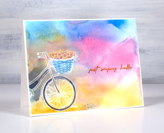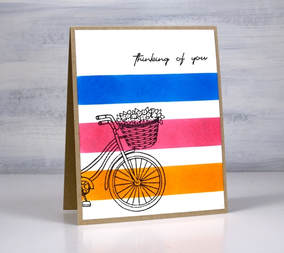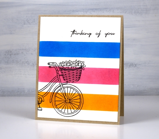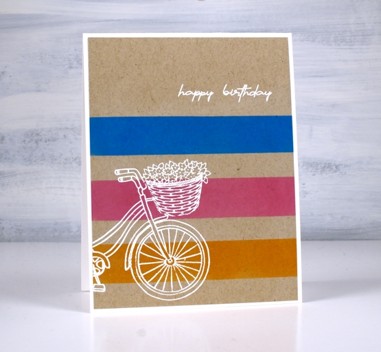 I went simple and graphic with my first two card layouts by blending oxide inks in stripes on both white and kraft cardstock. I stamped the ‘Spring Bike’ stamp in versafine clair nocturne above and embossed with Brutus Monroe alabaster powder below. I love how the white pops on kraft.