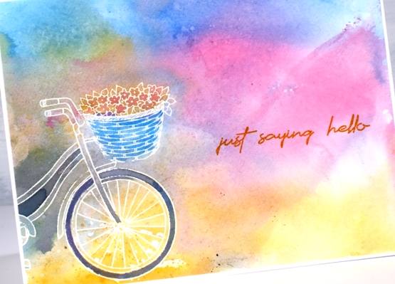 I thought I had finished after these two cards but the three oxide inks, rusty hinge, picked raspberry and salty ocean all wanted me to try a watercolour technique. I embossed the bike in clear powder on watercolour paper then smooshed the inks on my glass mat, spritzed with water, then swiped some watercolour paper through the inks several times to fill it with colour.