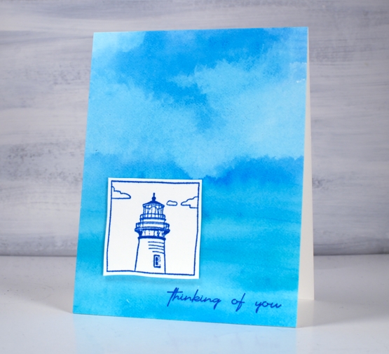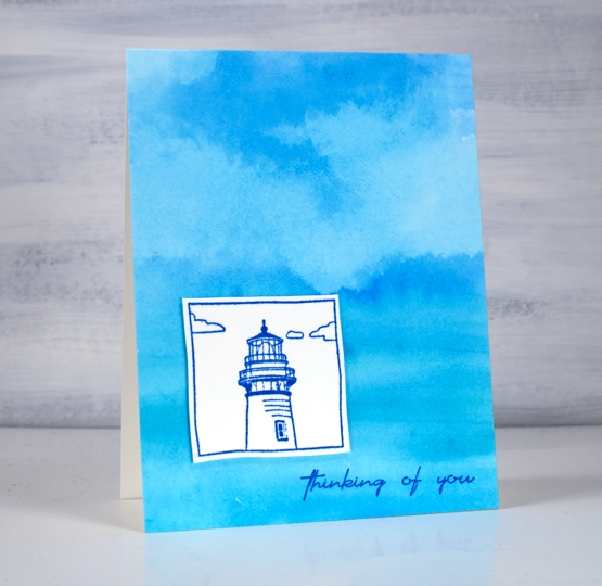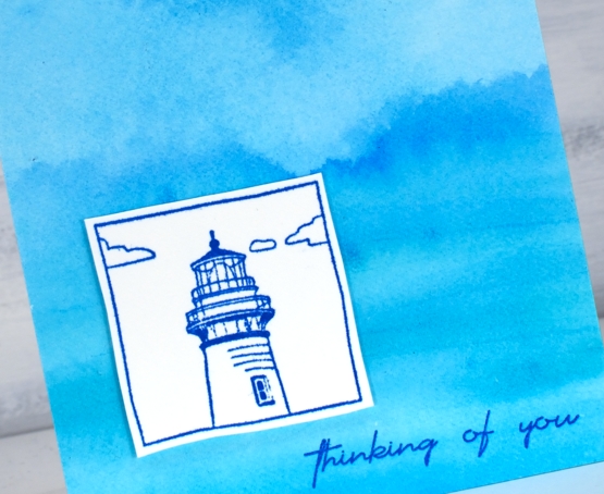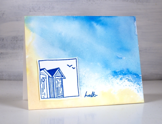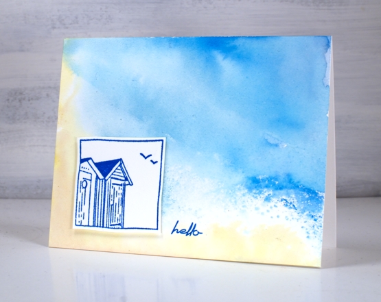 For both cards I completed the watercolour backgrounds first by smooshing distress inks on a glass mat, spritzing water and swiping hot pressed watercolour paper through the ink. I swiped more than once and tilted the panel so the inks could move. I tried to keep the yellow and the blues apart to avoid making green so there are a few gaps between the inks which looks like sea foam.