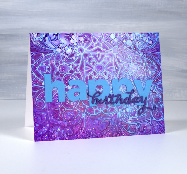I start with a layer of isopropyl alcohol on the panel, then add a couple of alcohol inks and tilt the panel to move the inks and cover the whole panel. Next I drop a stencil on top, for both these cards I used the Picket Fence ‘coloring book’ stencil; it’s 6″x6″ so the panel was larger than needed for my finished card.