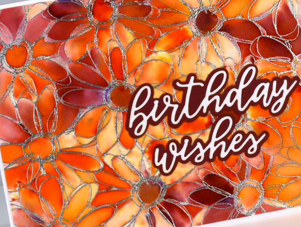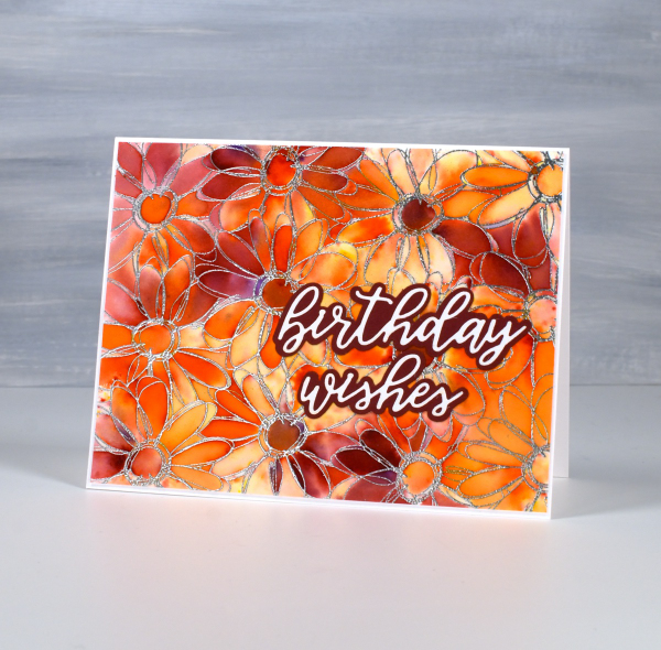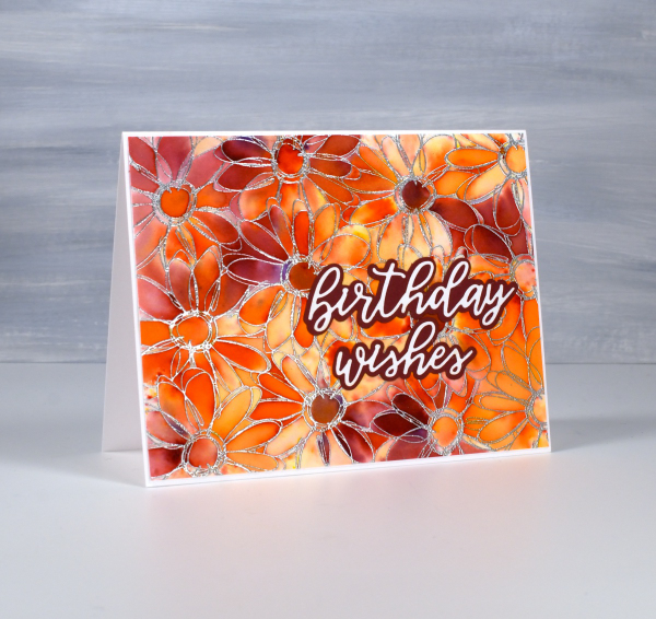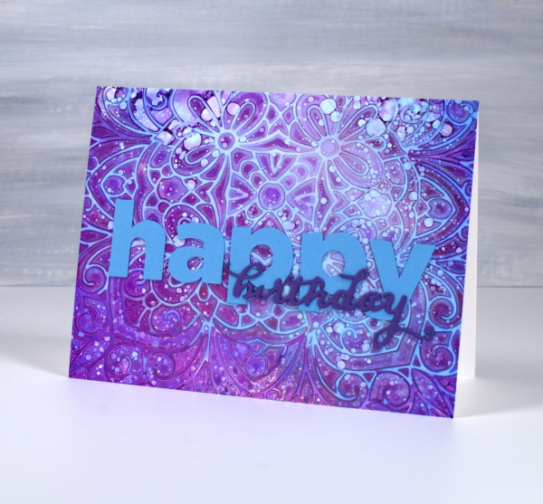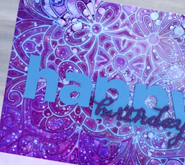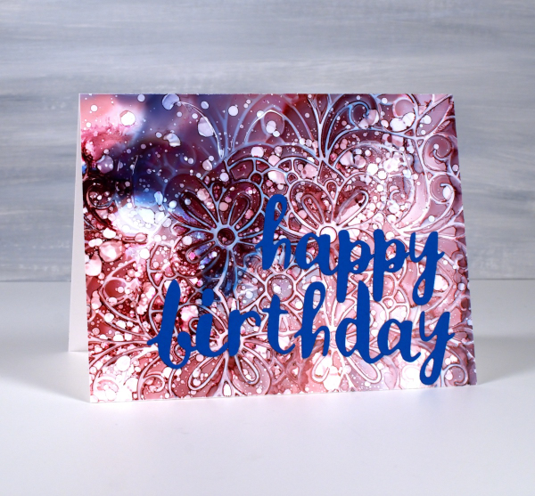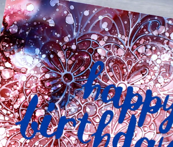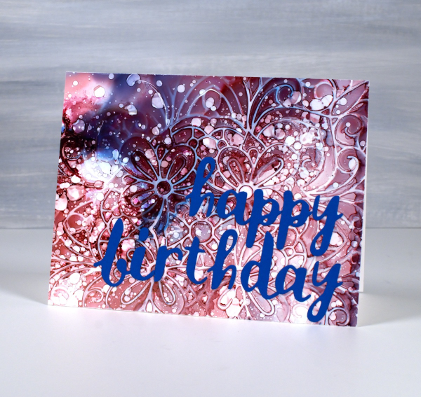 I have shared cards made with this technique before; it’s a fun one. I used alcohol inks on Grafix white craft plastic and for both cards I only used two inks along with isopropyl alcohol.