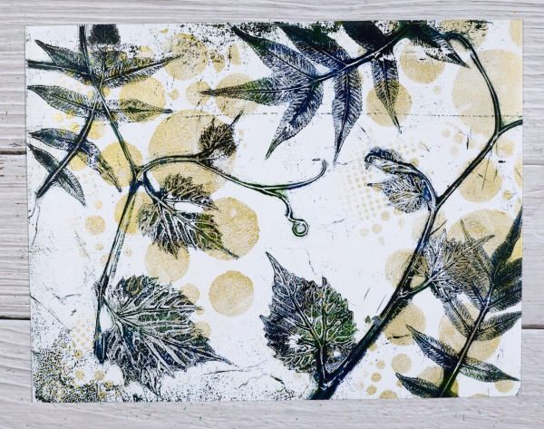 Even though I brayered blue, green and black paint very randomly on the plate, I like the way patches of one colour or another appear on the leaves.