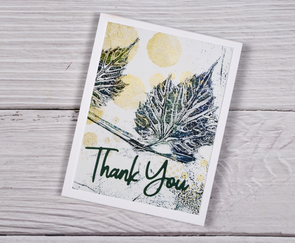 Last week I shared a leaf and lavender gel print video; in today’s video I have added some gold dots through the totally dotty stencil for some shimmer and extra interest. In the video you will see the gel printing process. I turned the printed panel into five cards and I have listed the added stamps or dies below each card photo. I have an in-person botanical gel printing class coming up on Saturday July 27th and there are a couple of spaces left if you’re interested.