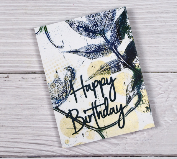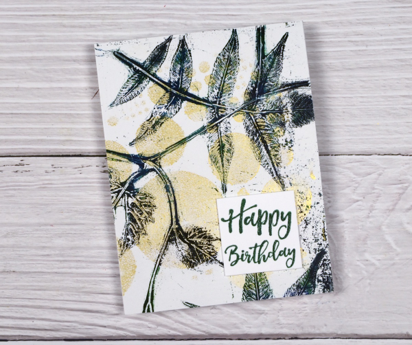 To create the card above I embossed a white panel using the Stampin’ Up embossing folder scripty, added a gold mat behind the gel printed panel and added a Darkroom Door sentiment from the ‘happy birthday’ sentiment strip.