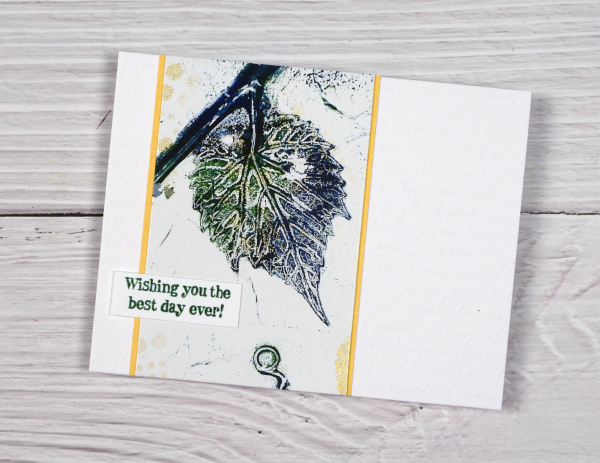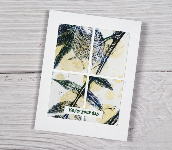 The panel above covers the whole card front and has a stacked green die-cut sentiment from the same Spellbinders set mentioned earlier. I stacked two layers for the sentiment to help it stand out from the stems on the gel print.