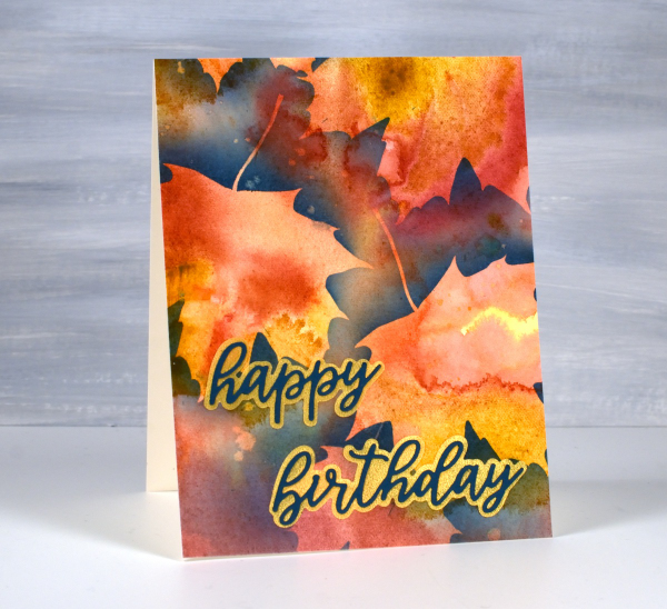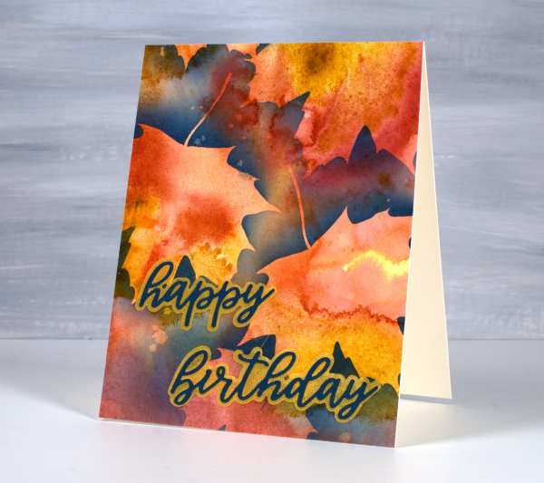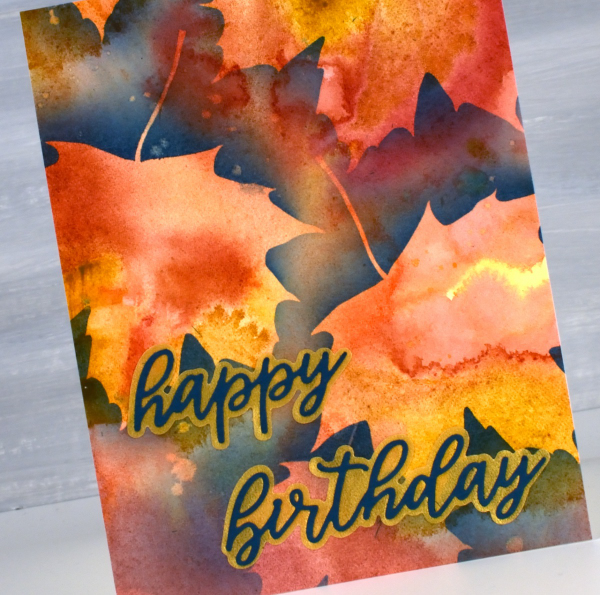 About a month ago I posted a video showing how I created a watercolour painting of leaves using masking (more leaves). Today’s card featured the same process using a maple leaf design from the Echidna Studios Leaves digital stamp set. Instead of painting the final dark layer over the masks, as shown in the video, this time I blended chipped sapphire ink using a blending brush. I think the navy edge around the leaves shows them off beautifully but because I didn’t blended too heavily you can still see the watercolour underneath. I finished this card off with a layered sentiment from the Spellbinders ‘serenade sentiments etched dies set‘