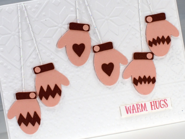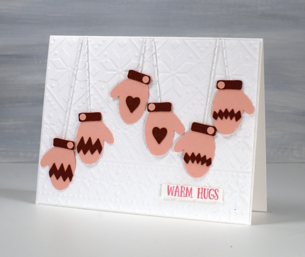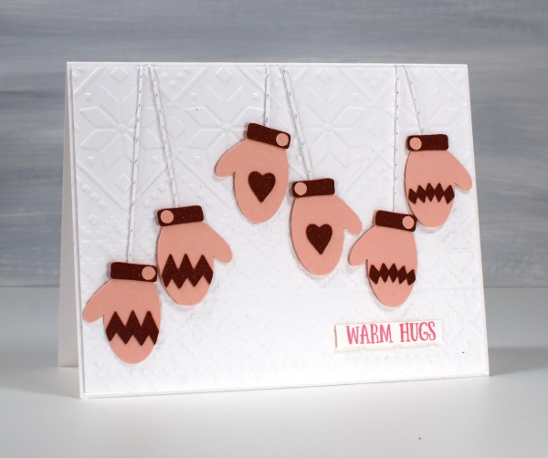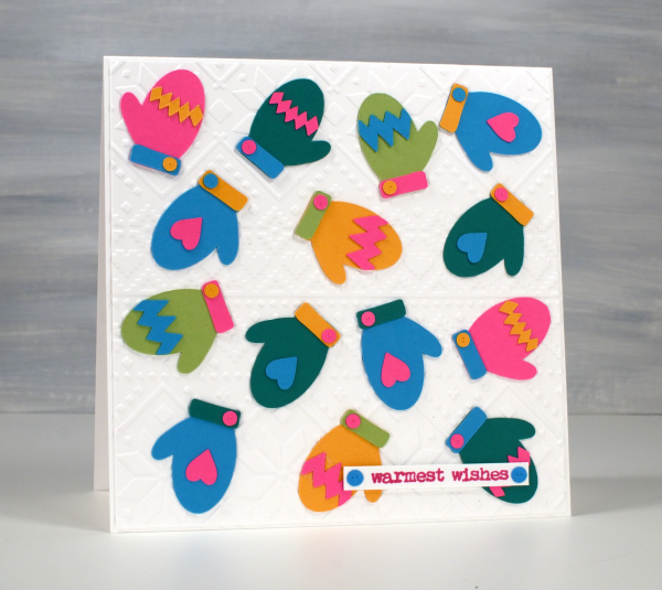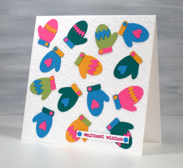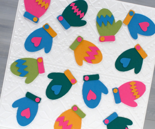 This colourful card started as an experiment to see how small the cricut would cut the mitts without tearing them. These little mitts are 1¼” in length; everything else is obviously smaller and cut just fine.