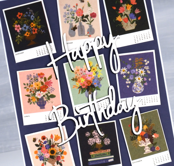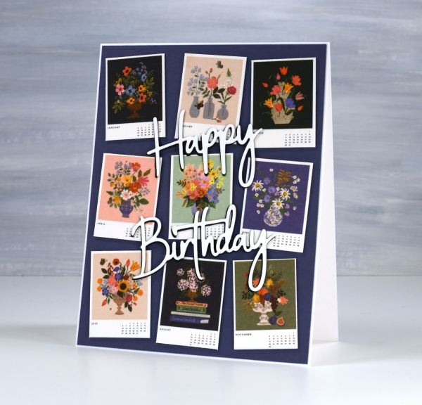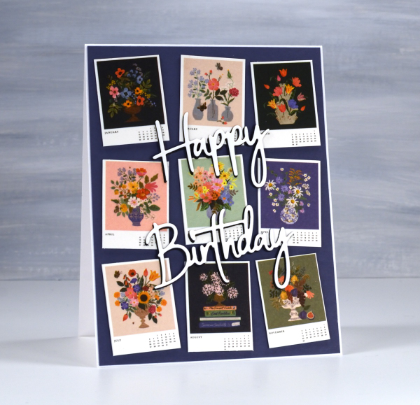 I’ve always liked the thumbnail page on a calendar. There’s something about seeing all the pictures in miniature which I find very cute. So when I bought a desktop calendar for a friend’s birthday I decided to remove the thumbnail page and create the card from the tiny month images.