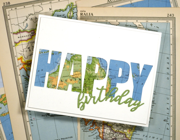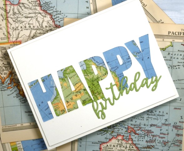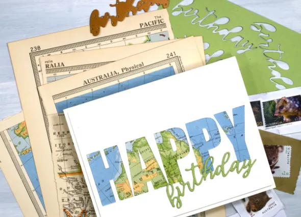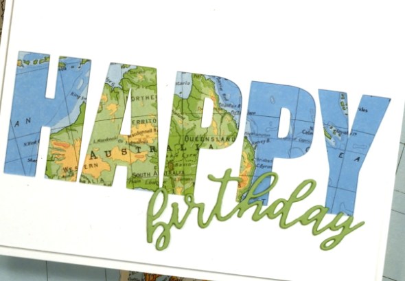 To create this birthday card for my son who just returned from visiting our family in Australia I had fun positioning the map behind the cut out to reveal some of the places he stayed. The map page is from an old atlas I am using for collage. The birthday die-cut is from the Spellbinders ‘serenade sentiments’ set which also has co-ordinating shadow dies. (currently the shadow for the word ‘birthday’ is missing somewhere in my work room!)
