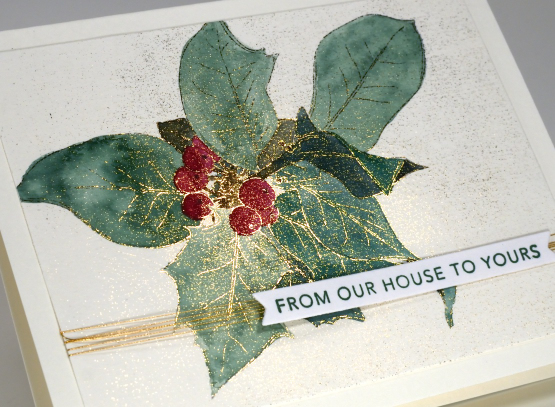 The foiling on these cards didn’t work properly yet here they are on display on my blog. I decided the foiling error was pretty enough to use anyway, I just can’t tell you for sure how to achieve this accidental look! The images are new digital stamps from Echidna Studios, called ‘Holly Leaves‘. I printed both images on hot pressed watercolour in my laser printer then foiled with gold foil. Whether it was a smudgy print or a different type of foil I’m not sure but foil attached to the background as well as the outline image.