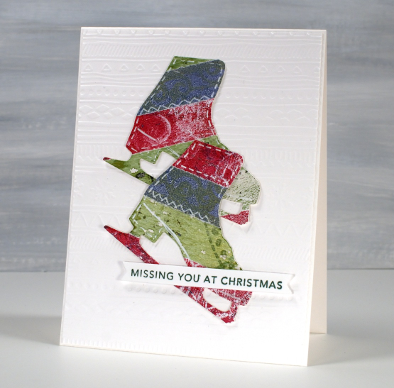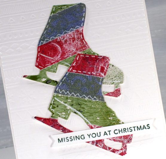 I used the Penny Black die set ‘let’s skate’ to cut two skates from the collage panel then popped them up on an embossed panel and added a Taylored Expressions sentiment from her ‘simple strips’ Christmas stamp.
