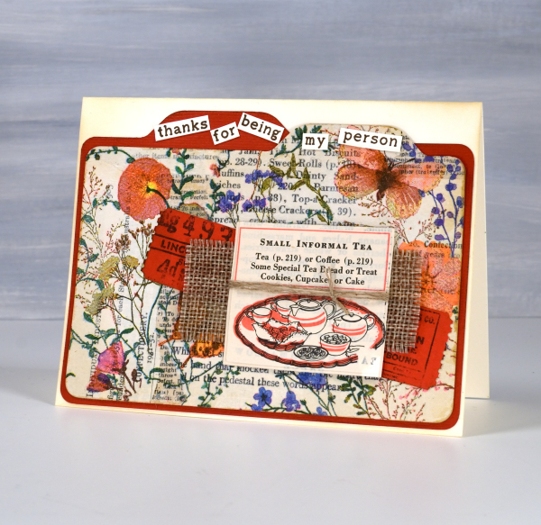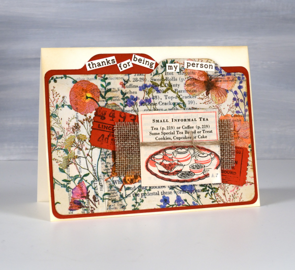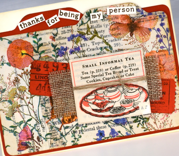 I recently bought a notch punch so I can create file dividers of any size; in the card above I made the blank orange one a little larger to show behind the floral & collage one. I added tickets stamped and die-cut, a scrap of hessian and a cut out from an old Betty Crocker ‘Good and Easy Cook Book‘!