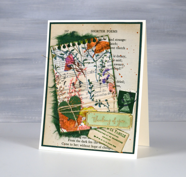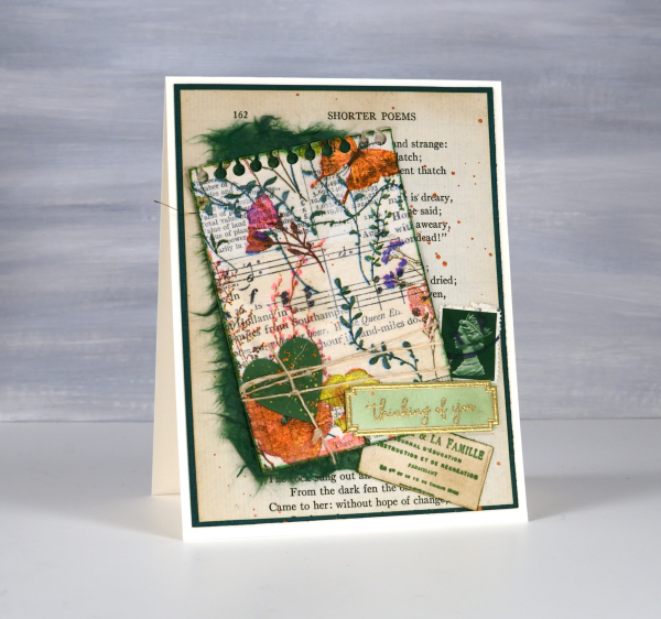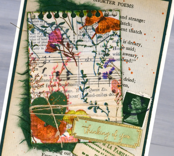 On the second card I used an aged book page as the background and added the paper napkin layer to the mini notebook page with some mulberry paper for framing and contrast. The little green postage stamp is real and the vintage label is stamped.