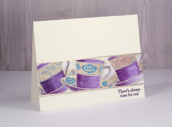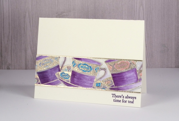 The teacups are stamped in versamark and embossed in platinum powder. After embossing one cup, I stamped and cut a tea cup mask, positioned it over the first cup then stamped a second and a third cup. I did all the colouring with tombow markers. When finishing the card a while later I tried my new versafine clair ‘monarch’ ink. I have always been happy with my versafine inks so I wondered what might be different about the new versafine clair inks. I have bought five colours to start with and so far I am very impressed with the sharp detailed stamping and no need for a second impression.