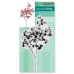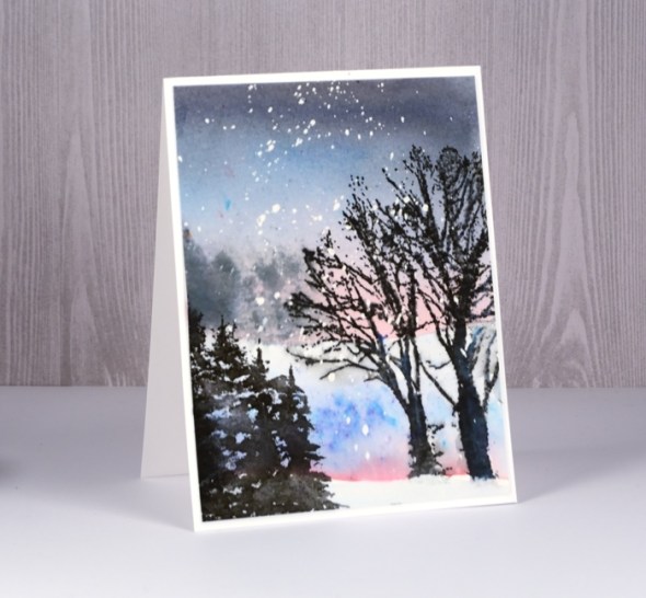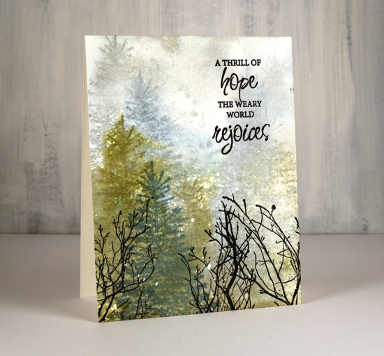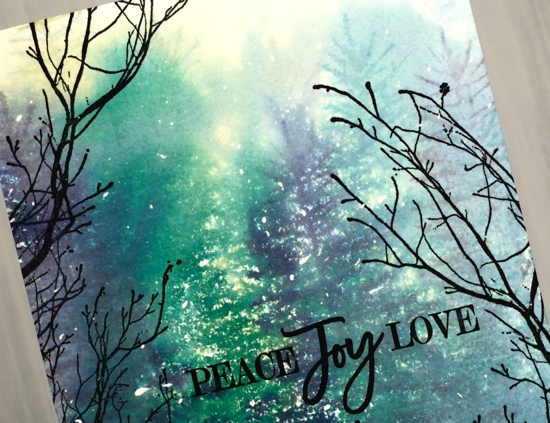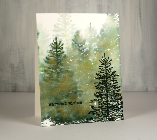 I used the same method for this card but used iced spruce, stormy sky and forest moss distress ink before spritzing with water. After the panel had dried a little but not totally I stamped a foreground tree in forest moss (or maybe a different ink, I’m not sure). After the panel was completely dry I added the fragile branches in black archival ink and in a stamp positioner so I could stamp a few times for a bold impression.