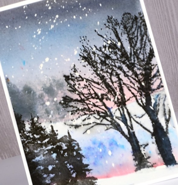 Posted: January 12, 2018 Filed under: dressed in snow, peaceful winter, snowy village, Stamped Landscapes | Tags: Brusho, Penny Black stamps, Ranger Distress inks, Tsukineko Memento inks 8 CommentsIt’s taking me a while to get back into gear here on the blog but I have been busy planning my next class. Living as I do surrounded by winter beauty I often look a the sky or the landscape and wonder how I can turn it into a card. This is one such attempt. I looked at the sky one afternoon, because the sun sets in the afternoon around here, there is no waiting for evening! There was a pale pink glow above the horizon, a little blue then grey reaching up. I was managing to create some subtlety with this scene right up until the brusho shook out of the bottle rather more generously than intended! No matter, a lot of water and paper towel calmed things down again.