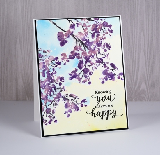 Posted: February 7, 2018 Filed under: graceful whisper | Tags: Penny Black stamps, Ranger Distress stains, Tsukineko Memento inks 14 CommentsThis branch has been waiting patiently for some ink so I went rather non-traditional and pulled out some purples to create this card. I splattered a few panels of hot pressed watercolour paper with masking fluid yesterday so I would have them on hand for future projects. The effect is subtle on this one but you can see little white dots in the sky and foliage if you look closely.