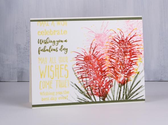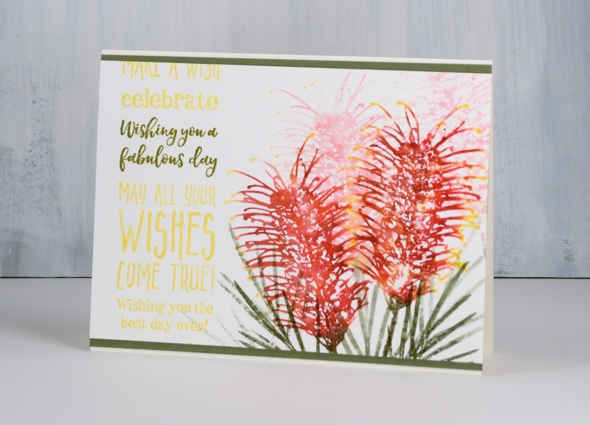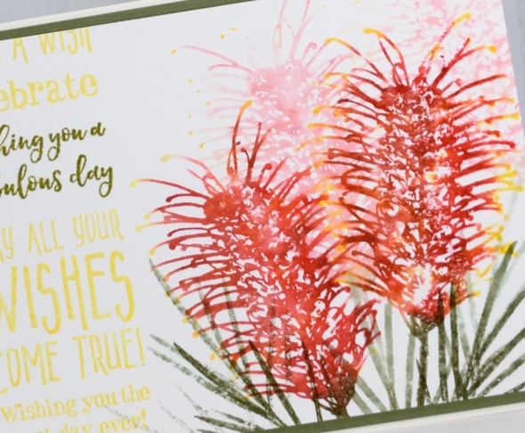 The colour scheme for this second grevillea card is based on the grevillea superb. This time I aimed to keep the tips of the petals yellow while the rest was red. I inked the whole flower in love letter and rhubarb stalk ink to fill the centre of the flowers with colour. Then, to preserve the tips I wiped ink off the ends of the petals and stamped. To finish the flower I added dandelion ink to the tips of the petals and stamped again. To get background images I spritzed the stamp and got a second generation image behind. For this one the leaves and stems were stamped in memento olive grove ink.