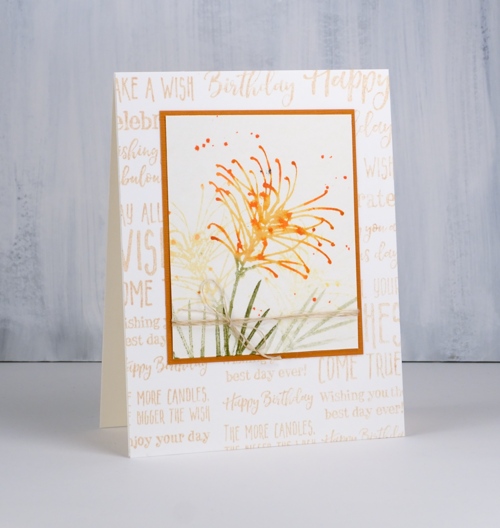 For this first card I based my colour choices on the grevillea juniperina sulphurea . I used distress inks and markers to ink first the flowers then the tips in scattered straw, wild honey and spiced marmalade. I stamped the main image and, without re-inking, stamped pale images behind. The leaves and stem are stamped in peeled paint, again first and second generation stamping. As stated in the challenge I kept the sentiment stamps together (they still are) and stamped the strip three times across the card base in memento desert sand ink. To finish I splattered some spiced marmalade stain, matted with a mustard cardstock and added some linen twine.