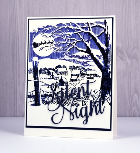 Posted: August 21, 2017 Filed under: Santa's visit | Tags: Penny Black creative dies, Penny Black stamps, Tsukineko Memento inks 3 CommentsI think this quiet little scene is going to be a popular one this Christmas. It looks so peaceful and pretty, just like it does around here after a fresh snowfall (which will be welcome in four months time and not before!) I kept my colour scheme simple for this one and stamped first in Paris Dusk memento ink. I then did some blending with a wet brush over the scene to solidify the image a bit before adding black ink. I did some partial inking of the stamp to get shadows on parts of the trees and houses.