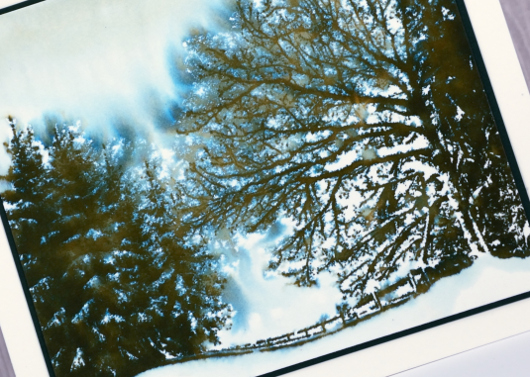 I spritzed the trees on the left very lightly to blend the colour and painted some tiny background trees on the horizon. Winter is very beautiful where I live but currently it is also rather bleak. Please forgive me the rather brief description; I created this one a while ago and the details are a little sketchy in my memory.