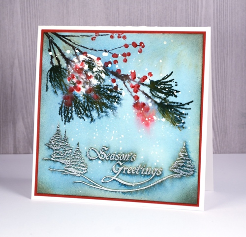 I began with a splattering of masking fluid over a piece of hot pressed watercolour paper. Once dry, I positioned the panel in a stamp positioning tool and stamped the ‘tree & greeting stamp’ from ‘A Festive Season’ set in memento northern pine ink. I removed the panel from stamp positioner but left the stamp in place. In the top left corner I stuck a circle of frisket film to mask a moon shape then painted over the whole panel with water. Colour bled out of the northern pine ink and started filling the panel; I added faded jeans distress stain so I could cover the whole piece with diluted blue/green colour. Once the panel was dry I removed the mask and placed the panel back in the stamp positioner away from the ‘tree & greeting’ stamp so I could place the ‘berry speckled’ stamp to overlap some of the moon. I inked and stamped one colour at a time with the following markers: berries – candied apple distress marker, needles – northern pine memento marker, and branch & twigs – espresso truffle and rich cocoa memento markers.To soften the look of the branch I spritzed it and let some colour bleed into the surrounding area. When dry I added shadows on the berries with the bullet tip of the candied apple marker.