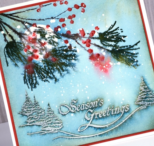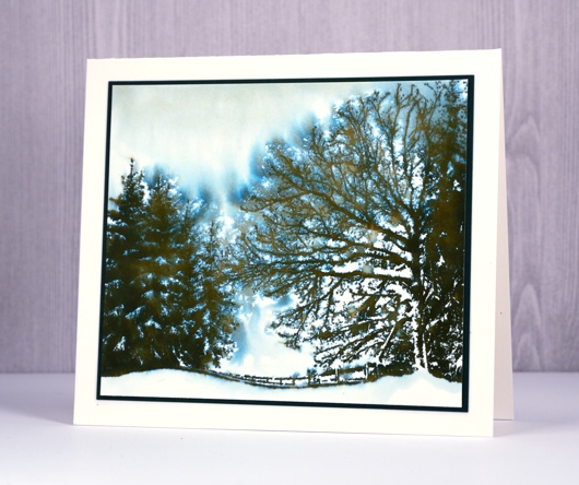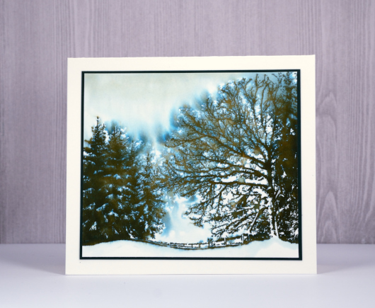 I wanted to preserve some white areas so I spritzed from quite a distance and covered the some areas with my hand as I did it so that I wouldn’t lose the look of snow on the lower branches. To finish off the scene I matted with dark green cardstock and attach to a white card base. I know I’ll be working with this stamp again!