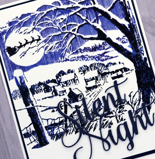 Posted: August 21, 2017 Filed under: Santa's visit | Tags: Penny Black creative dies, Penny Black stamps, Tsukineko Memento inks 3 CommentsI think this quiet little scene is going to be a popular one this Christmas. It looks so peaceful and pretty, just like it does around here after a fresh snowfall (which will be welcome in four months time and not before!) I kept my colour scheme simple for this one and stamped first in Paris Dusk memento ink. I then did some blending with a wet brush over the scene to solidify the image a bit before adding black ink. I did some partial inking of the stamp to get shadows on parts of the trees and houses.