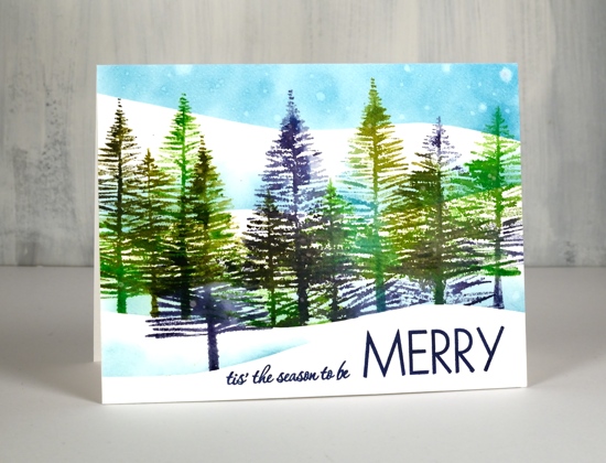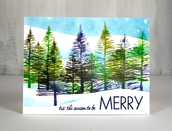 Both these cards were made on smooth bright white bristol cardstock which shows off the detail of the tree stamp beautifully. I made an improvement the second time I made this card so I will share my ‘better method’ with you here. I suggest stamping and embossing the child and sled first, that way any inking and blending done after will be resisted because of the embossing. When I tried just stamping in black after blending the sky there was a difference in the blackness of the child image because of the blended ink underneath.
