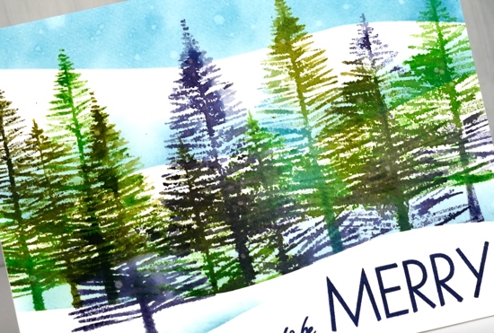 I inked one or two trees at a time with different combinations of the following distress inks: chipped sapphire, broken china, mowed lawn, peeled paint. Before I stamped I lightly spritzed the stamp so the colours would blend nicely. I moved the panel a couple of times and moved the stamps so I could get a decent row of trees at different heights. I sponged a bit of broken china ink along the top of the mask to create a shadow behind the snow bank then moved the mask to stamp a tree in front. I then moved the mask twice sponging both times to get another couple of snowy hill shadows to appear behind the trees and a blue sky.