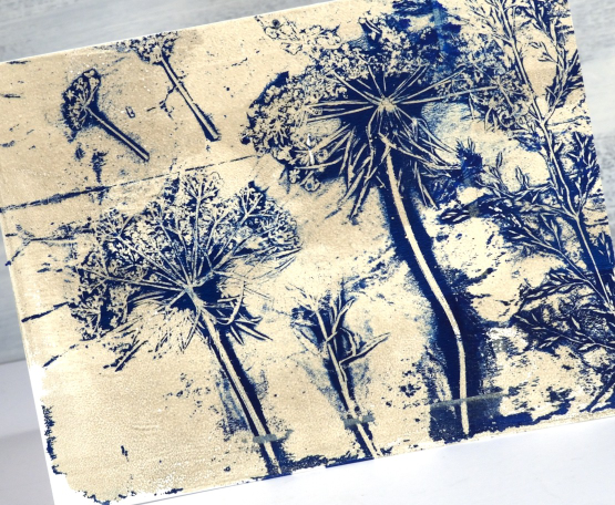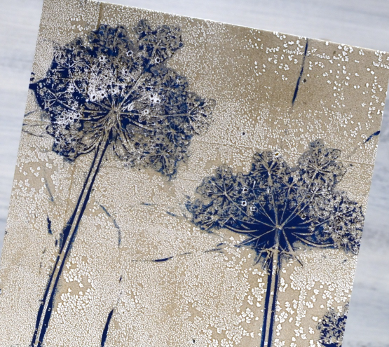 One of my favourite things to print on a gel plate is flowers. One of my favourite flowers to print is Queen Anne’s Lace. You might think, as I did, that Queen Anne’s Lace would be too fragile to print but it is surprisingly strong and the gel plate picks up all that delightful detail.