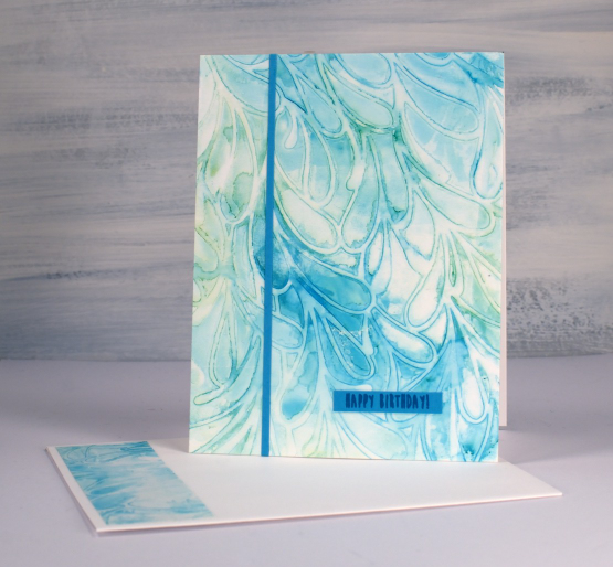 One of the reasons I like to work with alcohol inks on the gel plate is the fact that I can pull the prints with a piece of paper, in the case of these prints I used printer paper. When I work with alcohol inks apart from the gel plate I generally use a thicker plastic surface such as yupo or craft plastic. The inks move beautifully on those surfaces but the plastics are bulkier and a bit more expensive so it is nice to have the gel plate + paper option. The featured prints from today’s video were done on a 5″ x 7″ gel plate which meant I could get a 5.5″ x 4.25″ card front as well as a left over strip to add to the envelope.