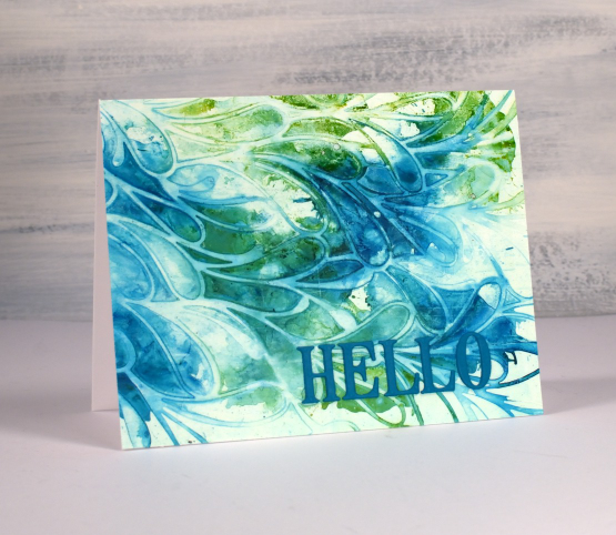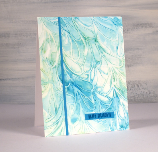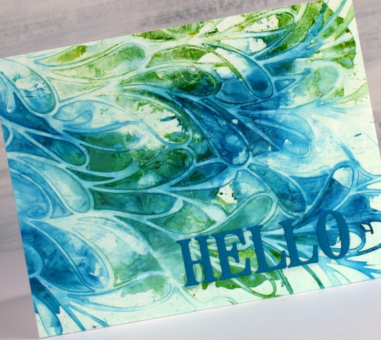 There are several ways to use a stencil with alcohol inks and this is just one. Make sure you check out Ardyth’s youtube channel for more ideas. I mentioned in the video that some alcohol inks tend to be a bit pushy and end up taking over a colour scheme. The lime green did so on this card but I’m glad there are some blues tones still visible at the base of the card.