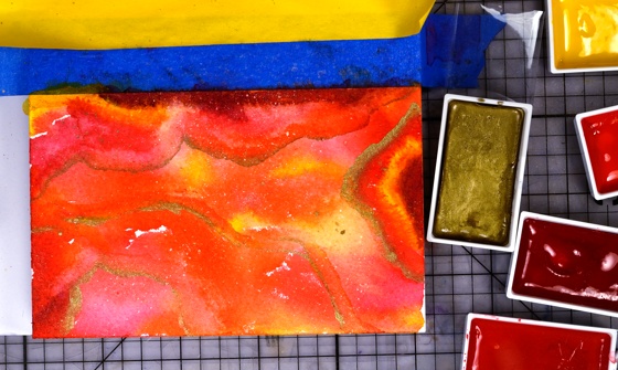 Add more paint to deepen the colours which will have dried paler than when you painted them. Add some metallic gold paint and some splatters. Let panel dry, then trim to desired size.
