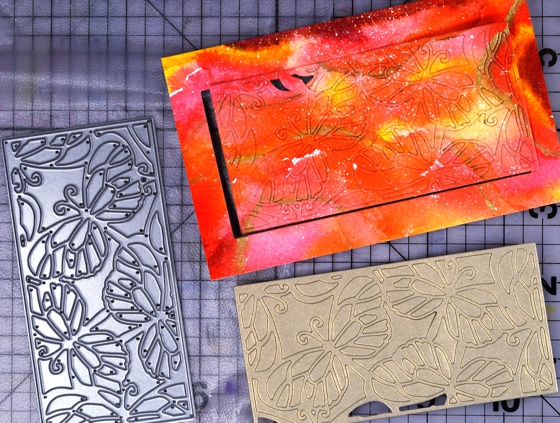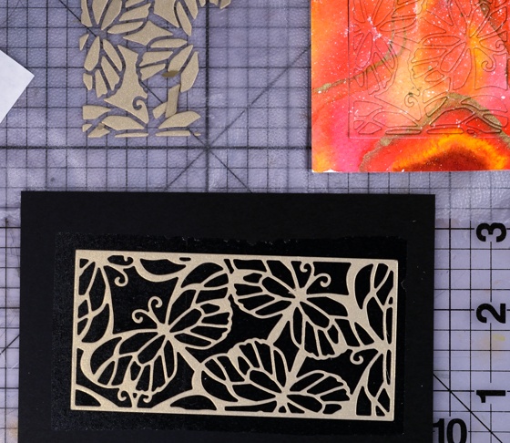 Remove the liner paper from the adhesive and press the gold ‘frame’ part of the butterflies die onto the adhesive covered cardstock.