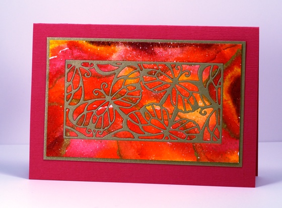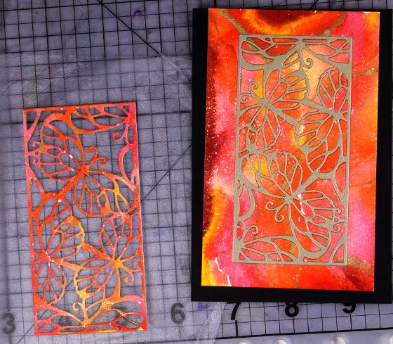 Attach the remaining border piece of watercoloured cardstock around the inlaid die-cut panel. Trim excess cardstock from the completed inlaid die cut panel. Mat with gold card then attach to co-ordinating card base.