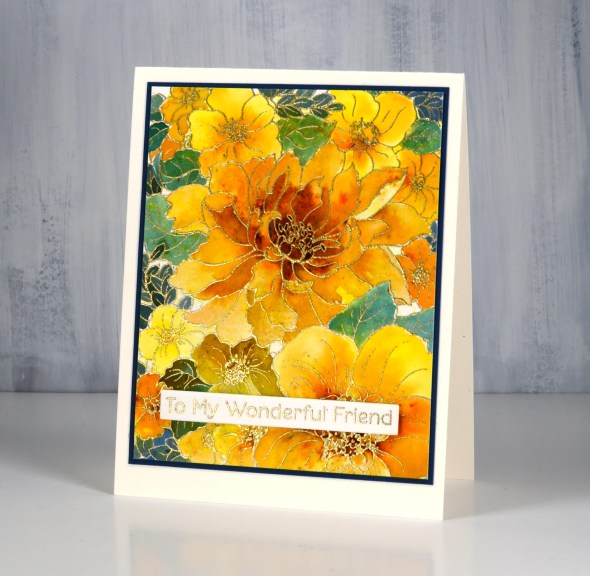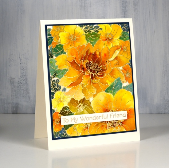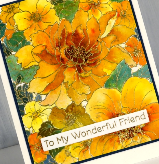 To mat the panel I chose a dark blue cardstock that co-ordinated with the dark bluey green paint. To finish the card I added an MFT sentiment also embossed in gold.