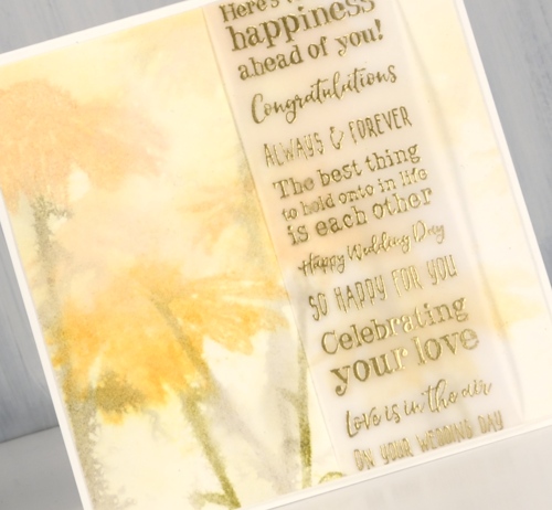 My second card features the ‘wet on wet’ watercolour technique. The watercolour panel was very wet before I stamped the daisy stamp in wild honey and forest moss distress inks. I restamped to get paler images then dried the panel before wrapping a vellum strip with gold embossed wedding sentiments over the stamped flowers.